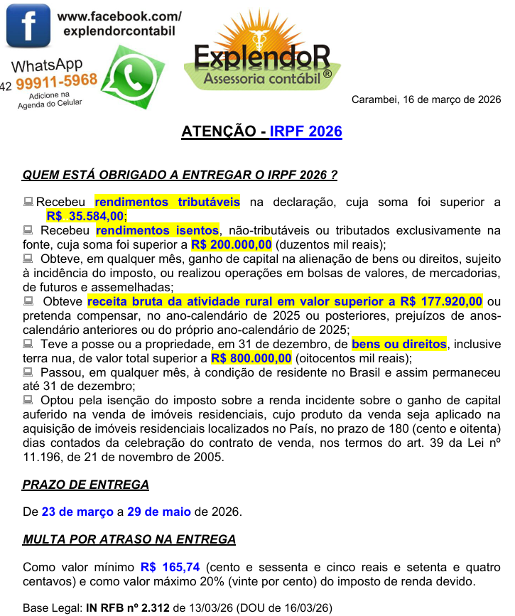 Compartilhe essa notícia Segue abaixo as Regras e Informações: (NAO DEIXE PARA A ULTIMA HORA!) Regras para o Imposto de Renda 2026 Navegação de Post Post Anterior← Receita Federal já rastreia movimentações no Pix; veja o que ela monitoraPróximo PostImposto de Renda 2026: Contribuinte terá de declarar ganhos com bets →